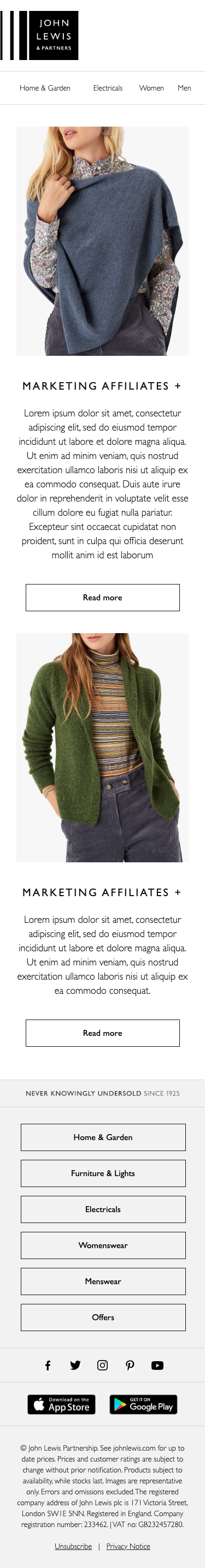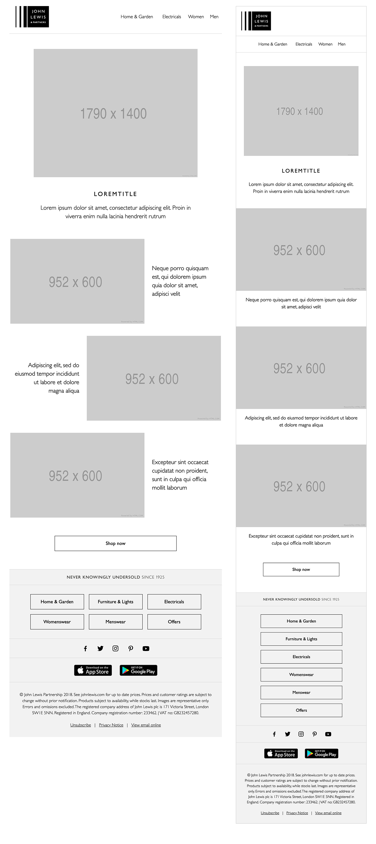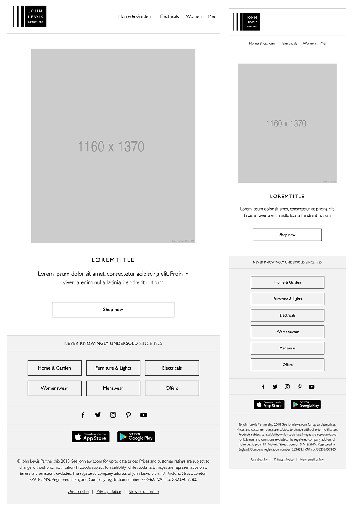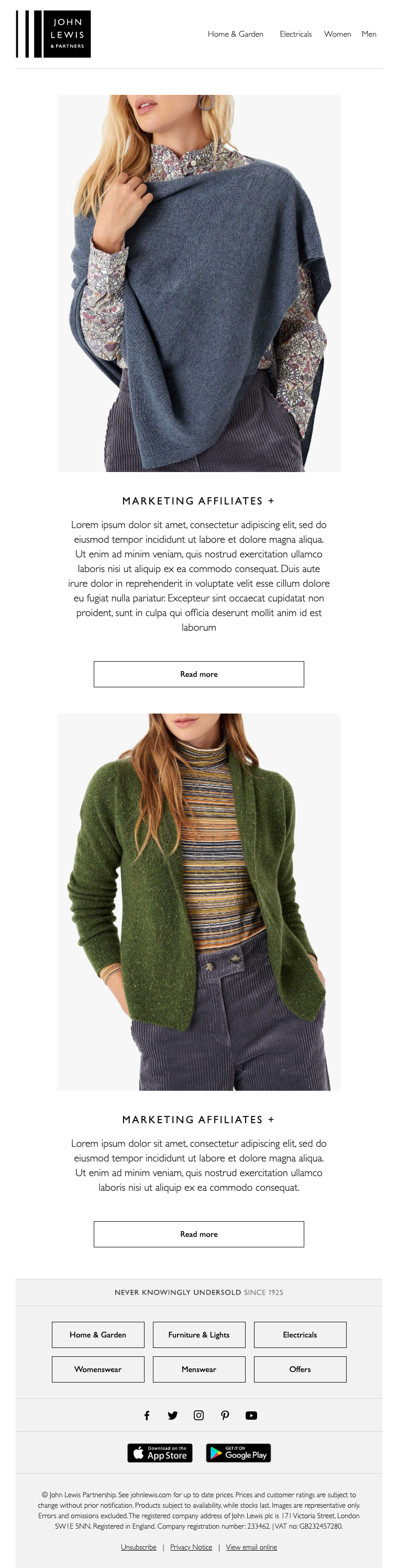 To create Mailchimp customised templates tailored for ease of use by a team with limited design and coding experience. Designing subscription emails aligned with the John Lewis brand, ensuring a seamless and consistent experience across all Affiliate marketing touchpoints.