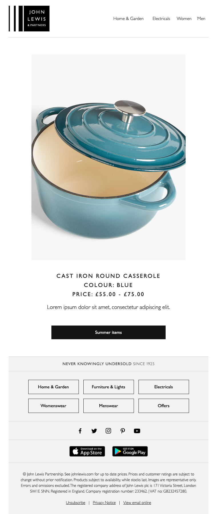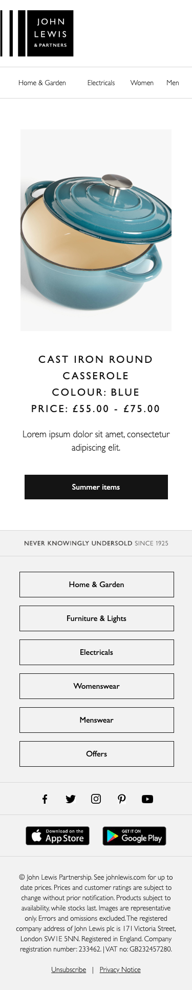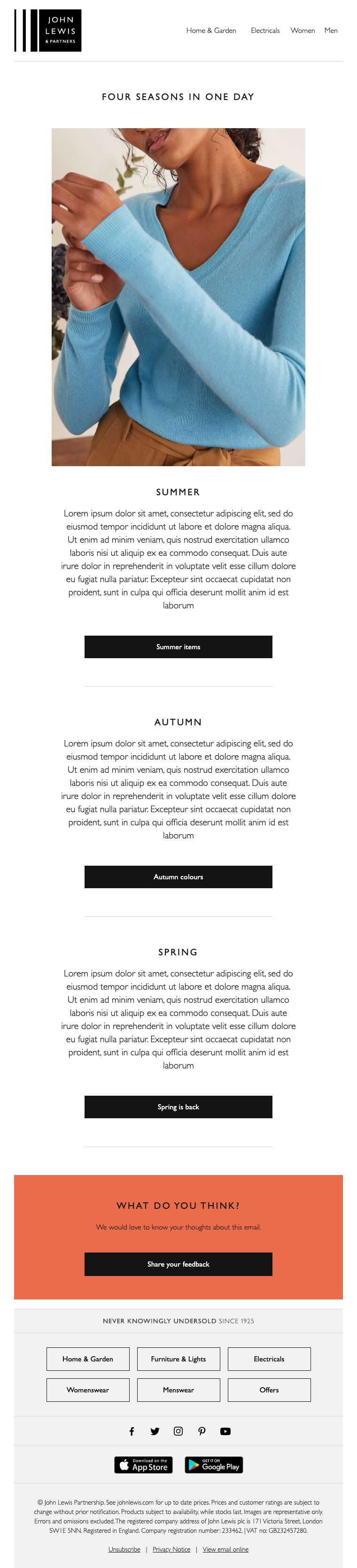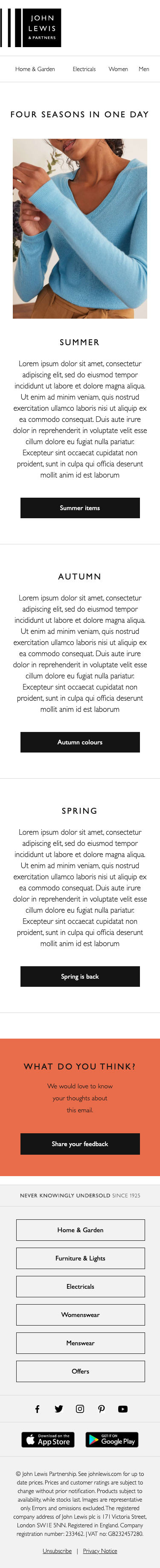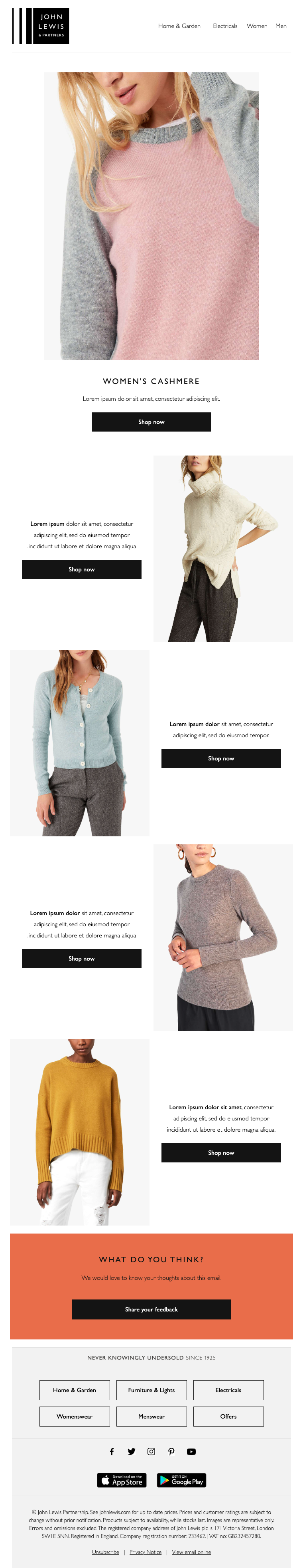 To create Mailchimp customised templates tailored for ease of use by a team with limited design and coding experience. Designing subscription emails aligned with the John Lewis brand, ensuring a seamless and consistent experience across all Affiliate marketing touchpoints.