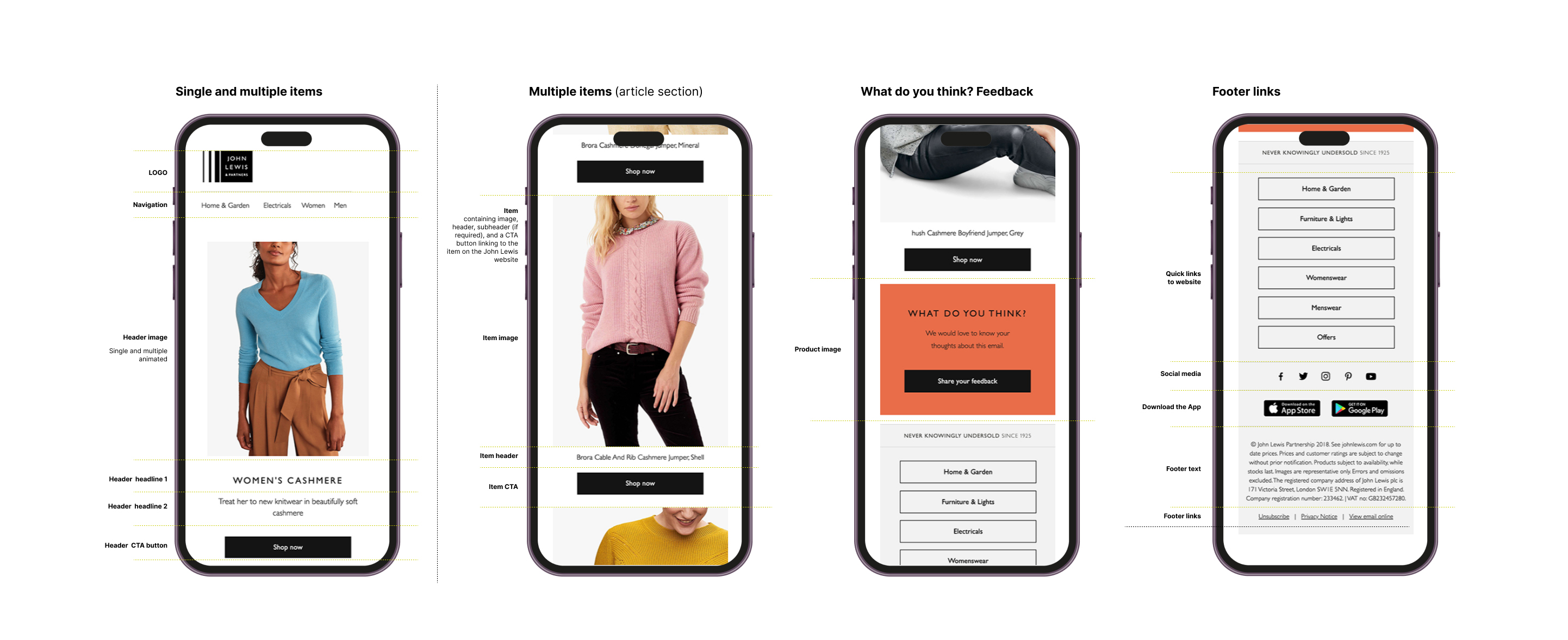 Templates — Four distinct templates were developed — each with its own layout tailored to different product configurations and content needs. These templates supported engaging subscription content, maintained full alignment with John Lewis branding.
