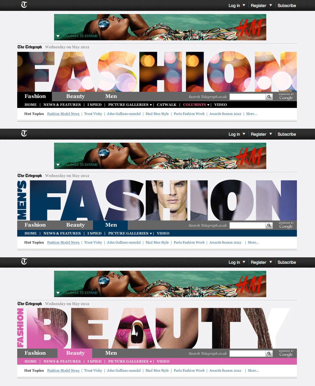 Creating a rotating brand identity for the Fashion, Men’s Fashion, and Fashion Beauty sections of the site. This kept the design fresh and flexible while staying visually consistent. The goal was to keep content engaging and aligned with trends and editorial updates.